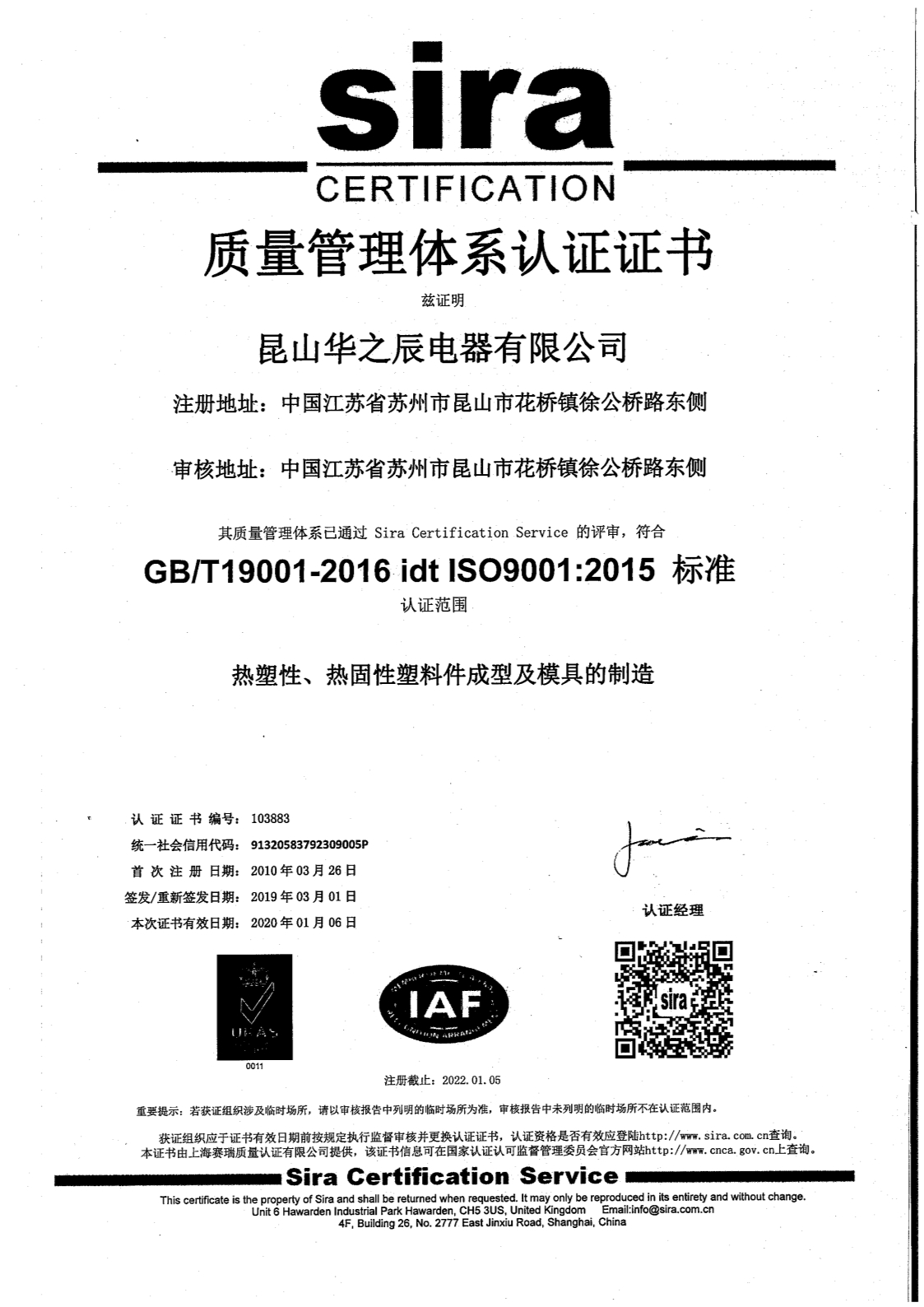 昆山華之辰電器有限公司于2006年9月設立成立,專業從事電木(UP,PF,DAP,MF,MU)、 密胺樹脂、高分子復合材料( BMC 、 SMC、 DMC )等熱固性塑料和熱塑性塑料 (PBT.ABS.PC.NYLON.PP) 射出成型加工。主要為SIEMENS、廈門 ABB 、施耐德、ELECTROLUX,、伊頓等世界知名客戶配套加工生產產品。 公司為開拓市場制定更優的發展戰略,目前已經擁有了進口電木、 BMC 射出成型機幾十臺( 100T-500T )及先進的模具加工設備、檢測設備,為生產出合格的產品提供了充足的設備保證。通過公司不斷的進取,于2007年 3 月通過 了ISO9001 :2000 質量體系認證,并于廠內全面推行全員質量管理和“ 6S ”運動。2011年通過ISO14001體系審核,并與2018年通過ISO14001體系跟蹤審核。制定有系統的環境管理程序。同時于2015年通過三級安全標準化審核,并于2018年通過復審。 公司從模具設計制作、制品成型加工與組立一體化之完善運營流程,更保證產品的品質與合理作業成本,使之在市場上更具竟爭力。我們一貫堅持“以質為本···